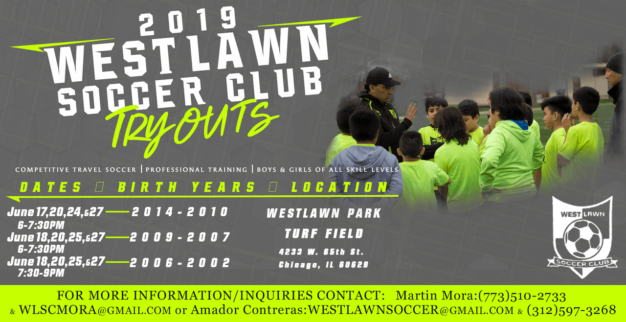 Estas pruebas (también llamadas "tryouts"), se realizarán para niños nacidos entre el 2002 y el 2014 en el Turf Field del West Lawn Park. Para mayor información pueden comunicarse con Martin Mora llamando al 773-5102733, o mandando un email a wlscmora@gmail.com, o con Amado Contreras 312-5973268 westlawnsoccer@gmail.com