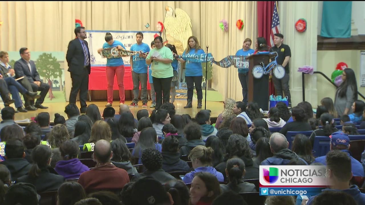 Decenas de padres, estudiantes y maestros se preparan para marchar por las calles de Logan Square para denunciar el desplazamiento de familias latinas trabajadoras a raíz de los altos costos de las rentas.
