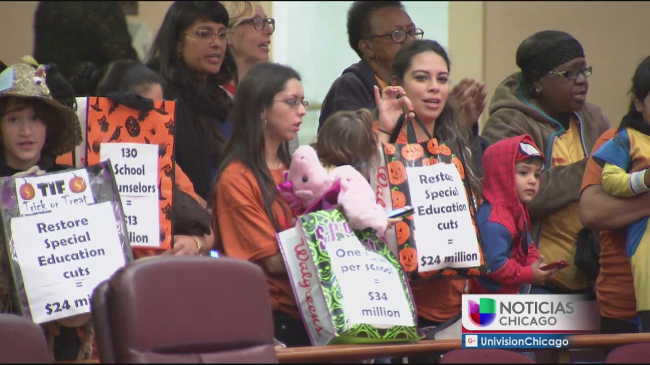 Un grupo de niños y sus padres en lugar de dulces de Halloween solicitaron en el concilio municipal de Chicago más recursos para educación pública.
