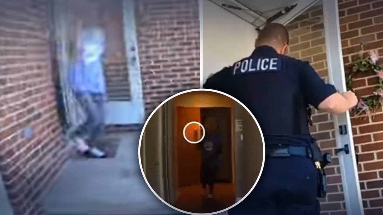 La anciana y la otra persona se apartaron de la puerta cuando Madeline Miller, de 64 años, se acerca a la puerta de entrada con un cuchillo de cocina en la mano.
