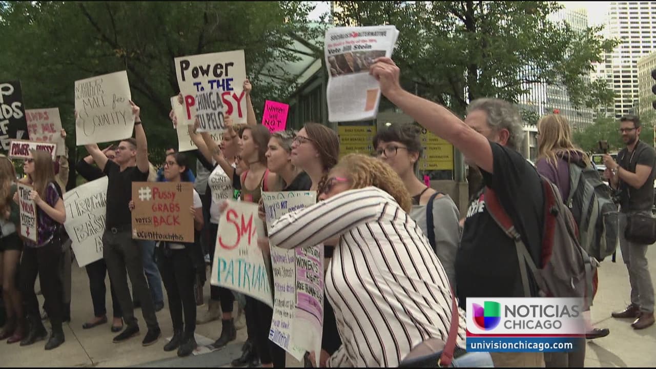Decenas de mujeres se dieron cita frente a la torre Trump en Chicago para protestar en contra del candidato republicano y para rechazar su lenguaje sexista.