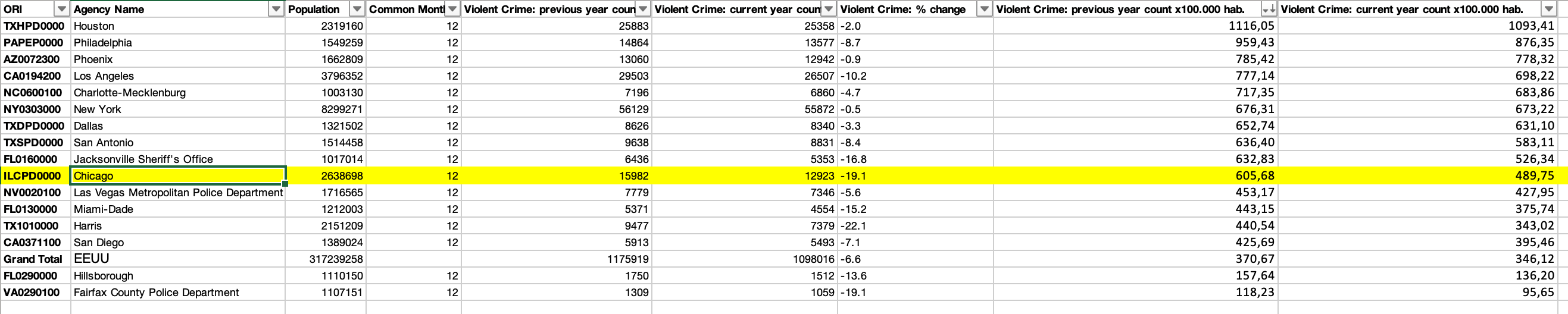 Es cierto que Chicago sigue siendo una ciudad violenta, con un índice de 489.75 crímenes violentos (violación y agresión sexual, robo, asalto y asesinato) por cada 100,000 habitantes, según datos recogidos por el FBI entre mayo de 2024 y abril de 2025, está, de entre las localidades con más de 1 millón de habitantes, en décima posición.