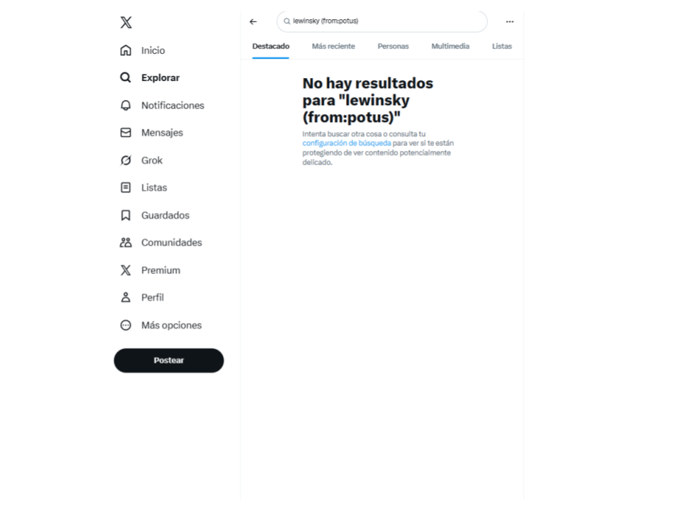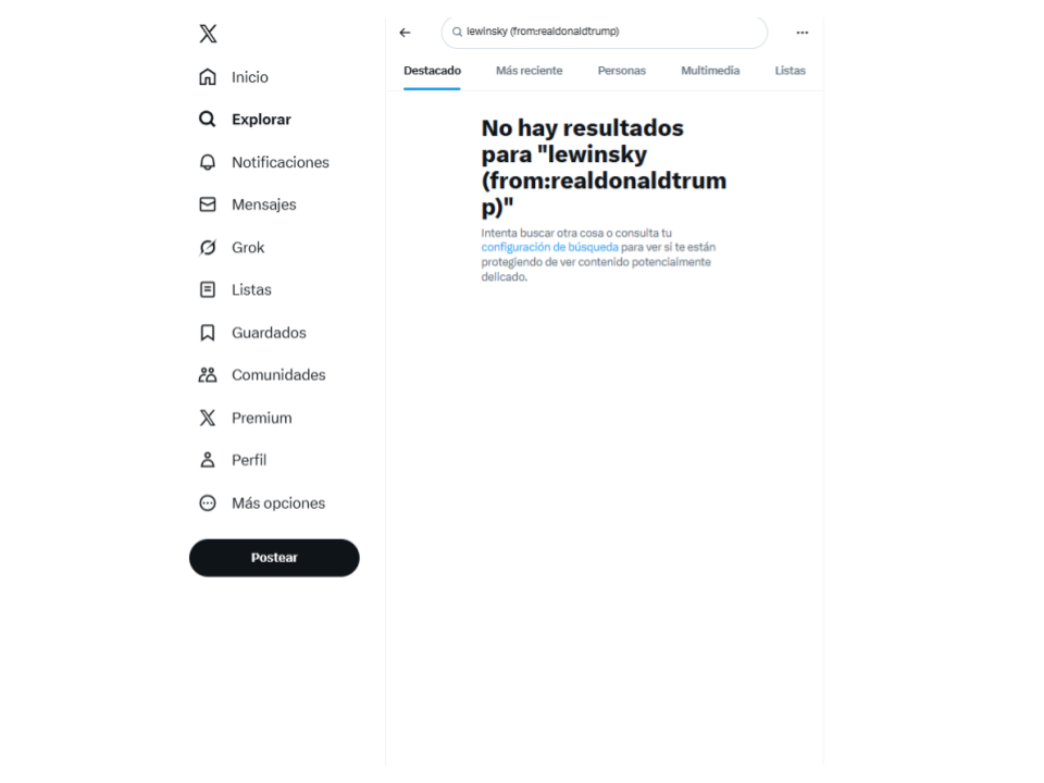 Otra búsqueda avanzada en X nos ayudó a verificar que el presidente no había posteado nada sobre Monica Lewinsky. De hecho, lo comprobamos en su cuenta @realdonaldtrump y en la de @POTUS ( President of The United States). No aparece ninguna mención a la palabra Lewinsky en ninguno de estos perfiles.