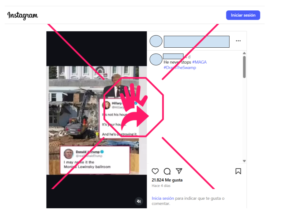 Una publicación en Instagram, que suma más de 21,000 me gusta, muestra un supuesto careo digital entre el presidente Donald Trump y Hillary Clinton. En el presunto intercambio, Trump parece responder desde su cuenta en X (antes Twitter) a una crítica de la excandidata presidencial demócrata a la remodelación que el mandatario está ejecutando en la Casa Blanca, diciendo que podría ponerle a la nueva sala de baile que se está construyendo el nombre de “ Monica Lewinsky”. Pero es falso que Trump hiciera tal comentario.