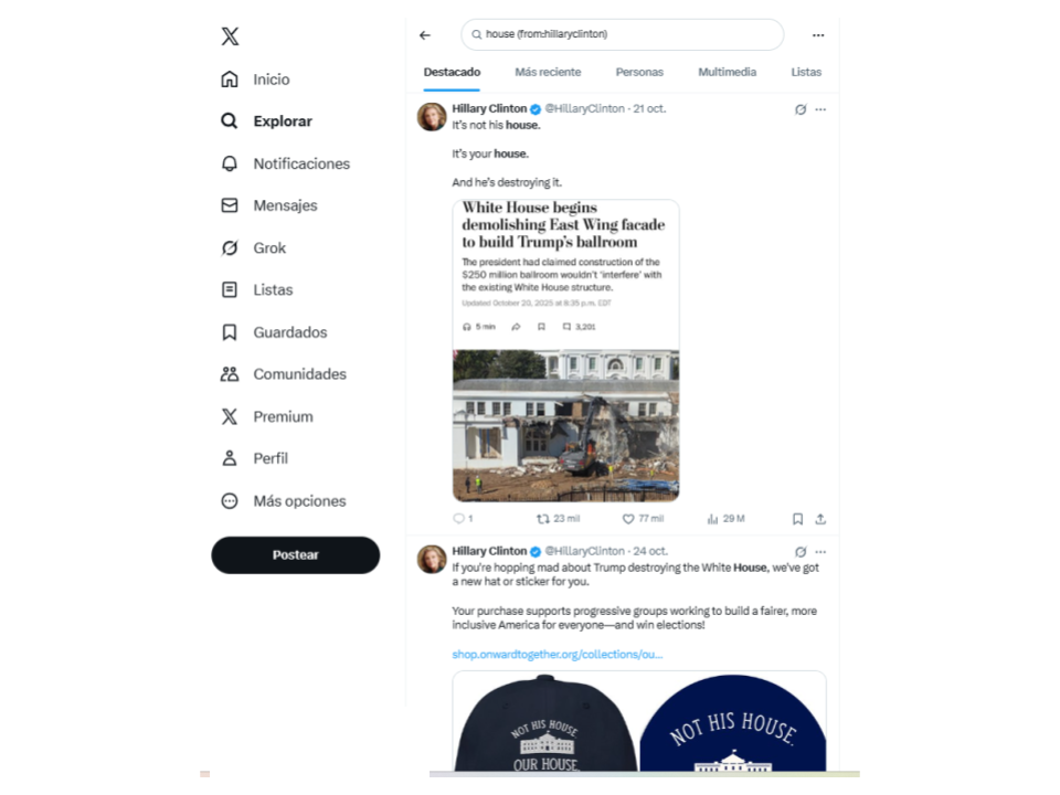 Una búsqueda avanzada en X (que facilita búsquedas específicas en esa red social) nos permitió comprobar que la excandidata presidencial y esposa del expresidente Bill Clinton, Hillary Clinton, efectivamente cuestionó desde su cuenta en X a Trump y la construcción del salón de baile. El 21 de octubre de 2025 escribió: “No es su casa. Es tu casa. Y él la está destruyendo”; y acompañó el texto de un titular con los detalles del costo de la construcción.