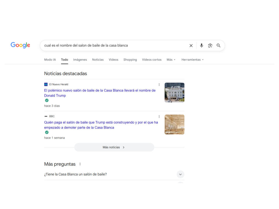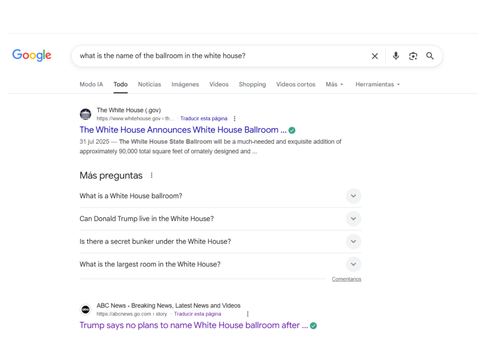 Búsquedas con palabras clave en Google, en inglés y español, no arrojaron resultados sobre el supuesto nombre del salón de baile que se está construyendo.