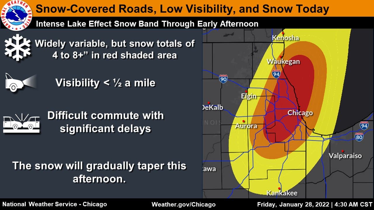 La nieve se presenta principalmente en Chicago, aunque alcanza algunas zonas de Walkegan y Aurora.