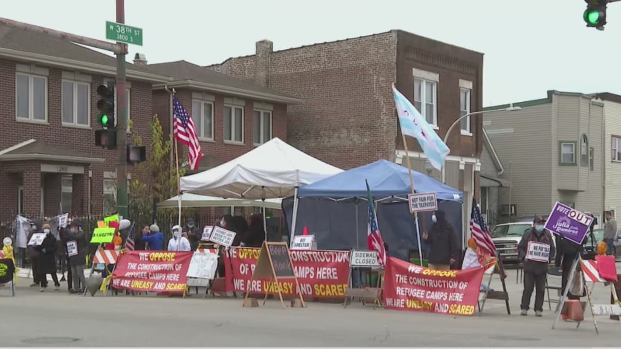 Protesta en inmediaciones al terreno en Brighton Park donde se construirá campamento para migrantes