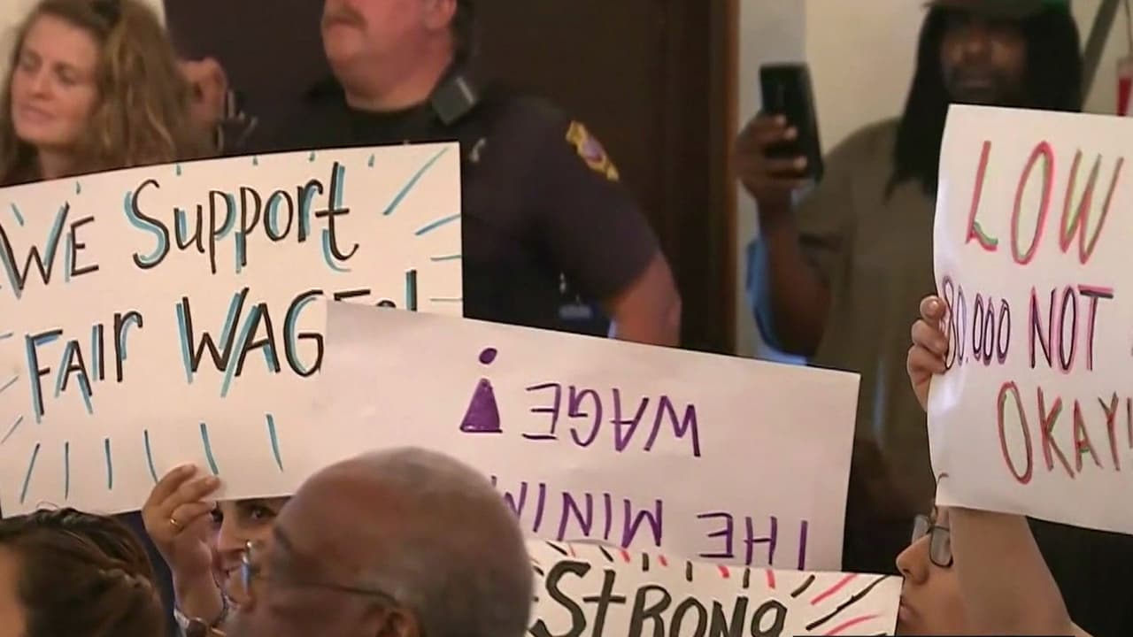 Los manifestantes interfirieron varias ocasiones en una reunión entre la alcaldesa, Michelle Markiewicz, y funcionarios municipales después de que rechazaron una propuesta del aumento al sueldo que fue aprobada por el 80% de los votantes.
