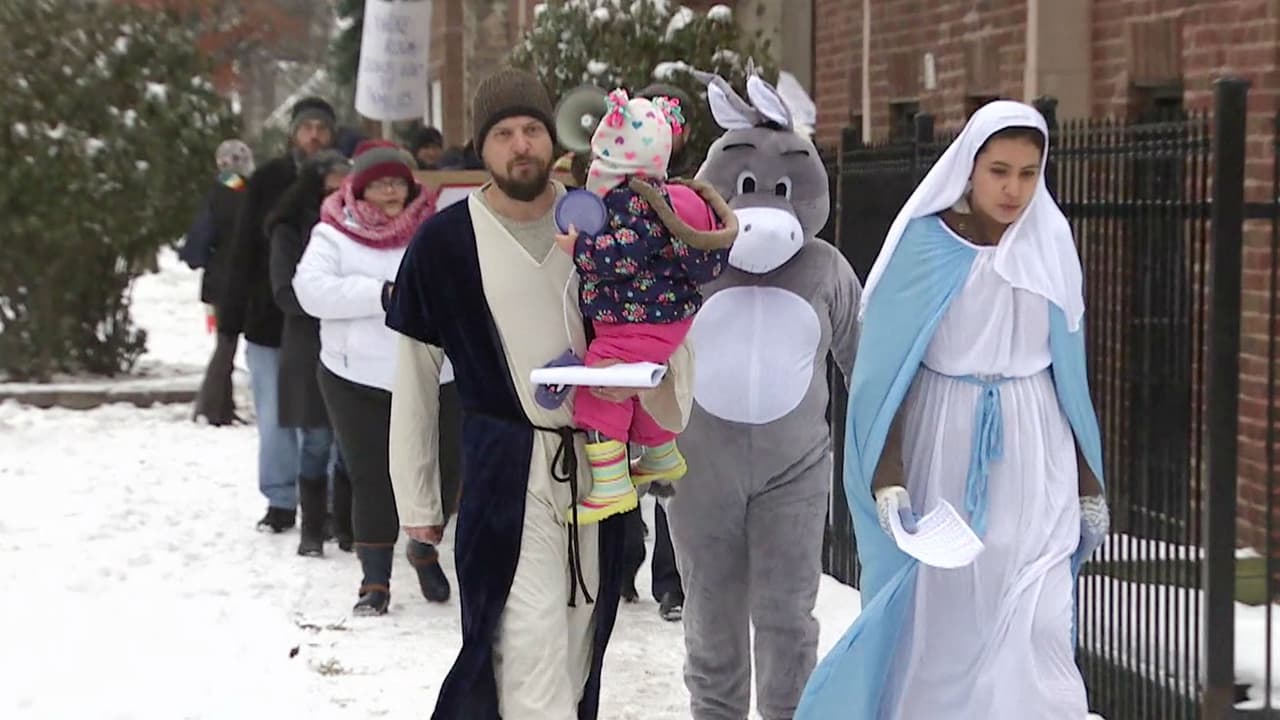 Disfrazados como la escena bíblica en que José y María buscan posada para pasar la noche en Belén, residentes de Logan Square se movilizaron para luchar por vivienda accesible en esa área para familias de bajos recursos. la manifestación se llevo a acabo dentro del marco de La Posada