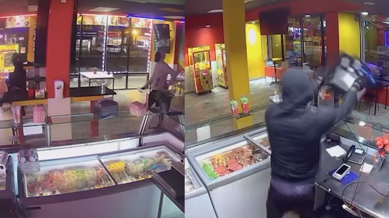A las 4:45 a.m., se ve a los maleantes romper la puerta de cristal de la sede de 'La Michoacana' ubicada en la cuadra 3100 oeste de la avenida Lawrence, en East Albany Park. Solo duraron 4 minutos en el interior, pero tiraron las cajas registradoras al piso, e intentaron romper los cables que tenían.