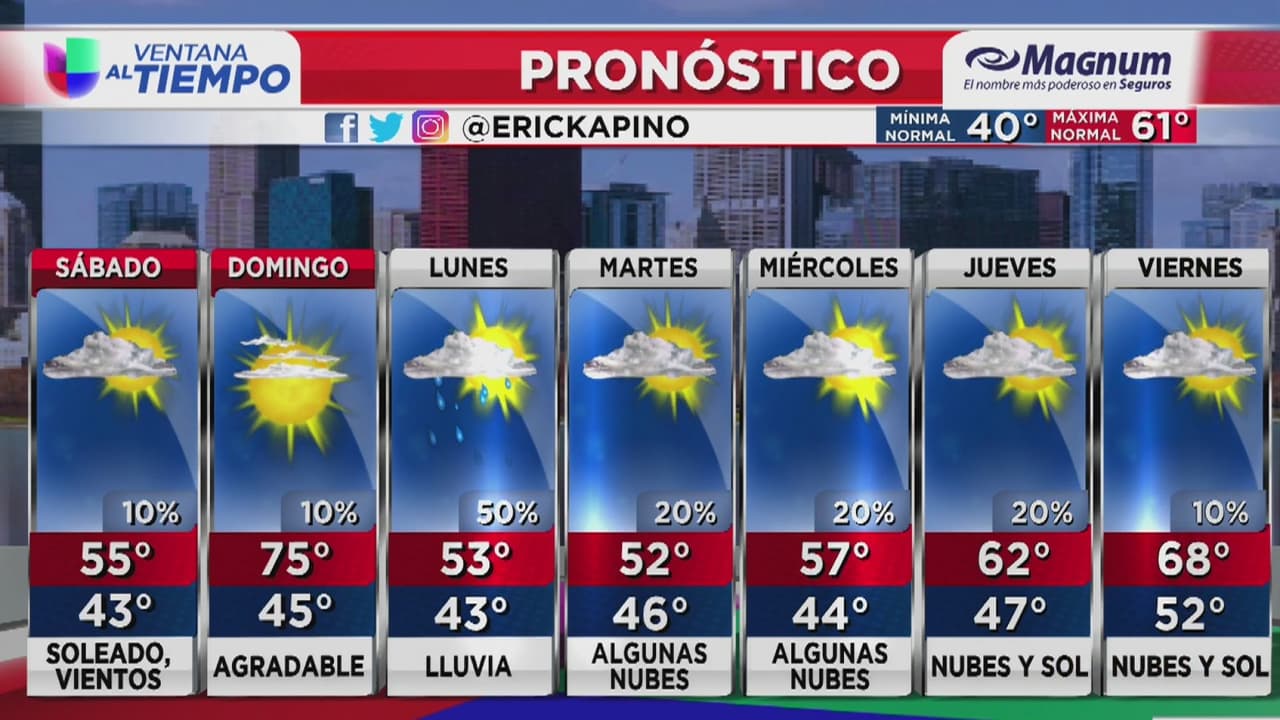 Según el pronóstico, las ráfagas perderán su fuerza y sus velocidades oscilarán entre las 15 y las 20 mph. La temperatura máxima será de 55 grados Fahrenheit, mientras que la mínima estará en los 43.