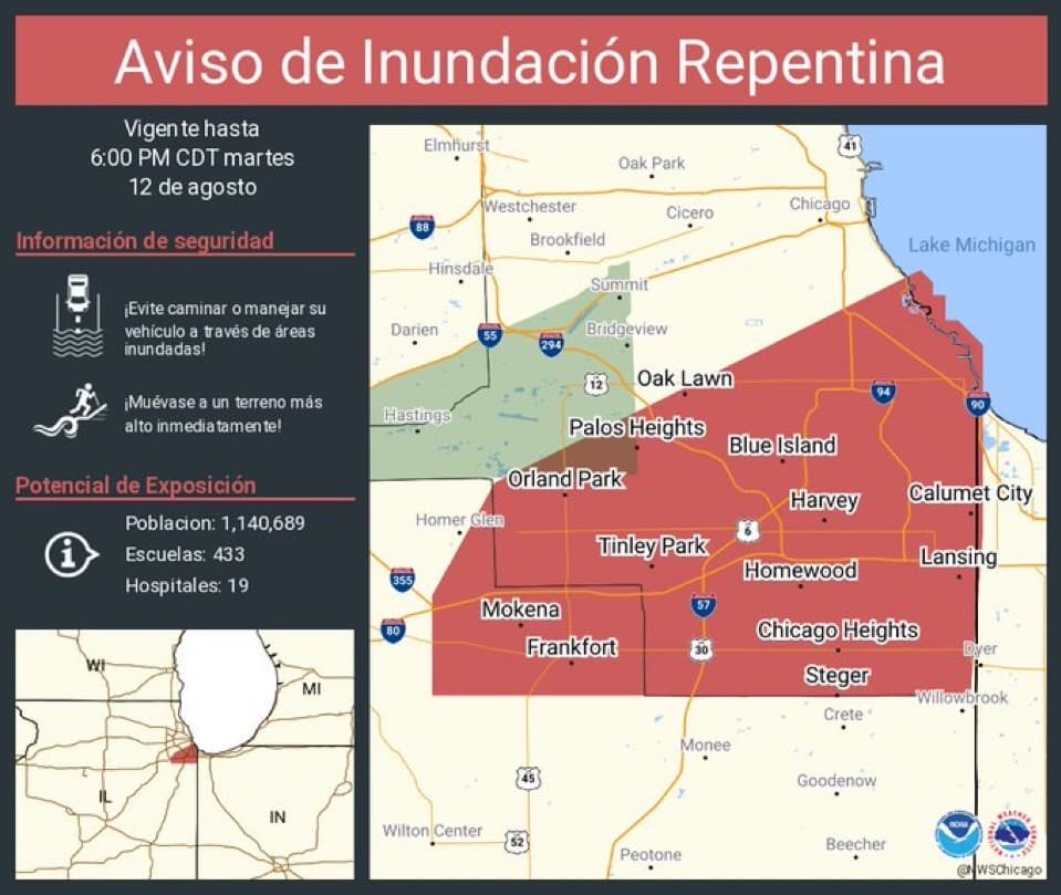 Los condados bajo vigilancia por inundación hasta la medianoche son Cook, DuPage, Will (Illinois) y Lake (Indiana) y un aviso de inundación repentina vigente hasta las 6 de la tarde en el condado de Cook y el noreste del condado Will.