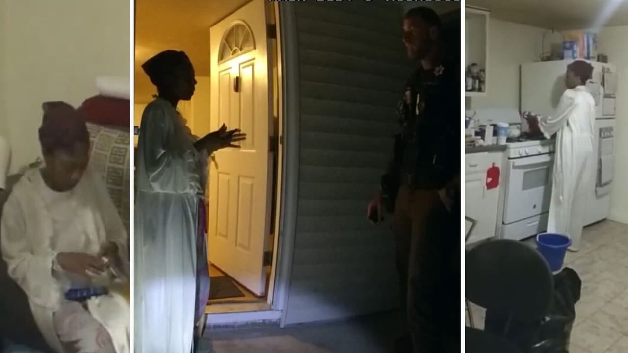 Luego se observa a los oficiales hablando con Sonya Massey, mientras busca la identificación que Grayson le había pedido. El otro oficial le pide a Massey que vaya a la cocina para apagar la hornilla de la cocina, donde había una olla que supuestamente contiene agua hirviendo.