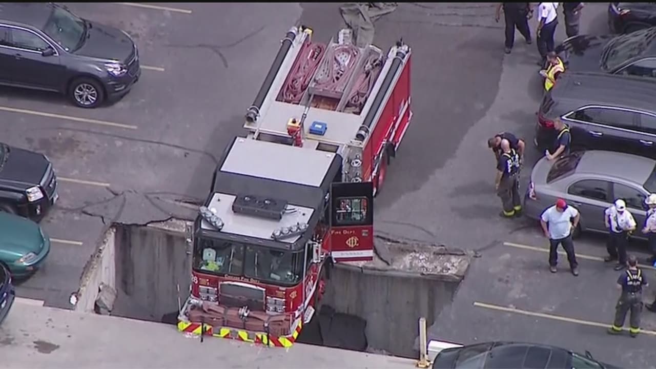 Un camión de bomberos queda suspendido sobre un enorme hueco en el sureste de Chicago