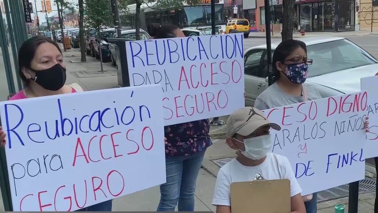 Un grupo de personas en Pilsen protesta ante la presencia de desamparados cerca de una escuela