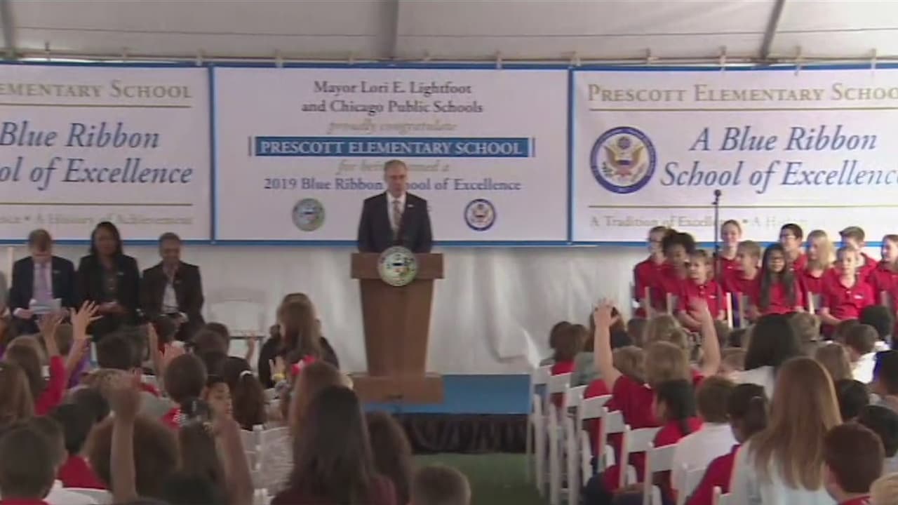 Prescott Elementary School se destacó entre otros planteles de la ciudad por su alto desempeño y excelencia académica. Se trata de un reconocimiento nacional que recibirán 312 escuelas en todo el país. La alcaldesa Lori Lightfoot participó de la celebración.