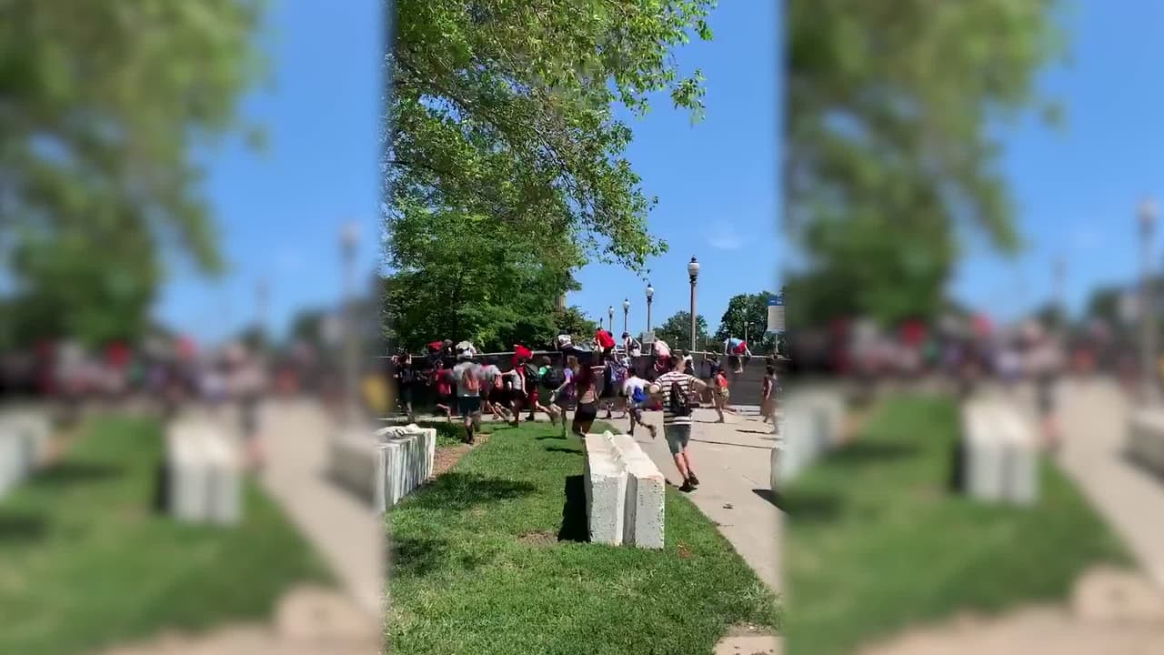 Tuiteado por Jeremy Cohen, el video muestra a docenas de personas saltando y trepando por la cerca, incluso derribando parte de ella. Se ve a un oficial en un video que detiene a una persona con una pierna protésica.