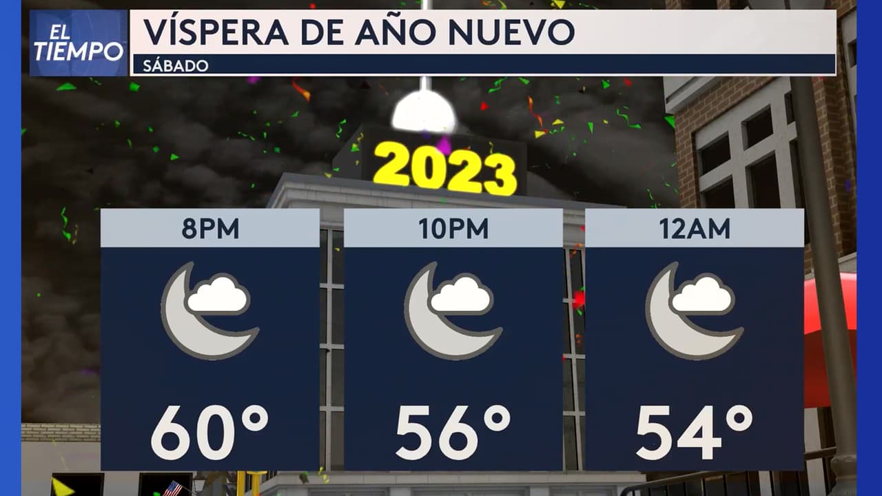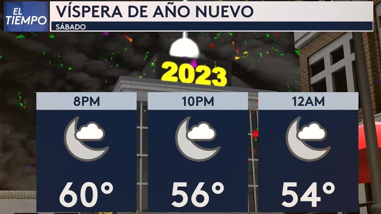 En el sábado y víspera de Año Nuevo, la temperatura estará en los 60 grados a las 8:00 pm, en 56 grados a las 10:00 pm y para recibir el 2023, justo a las 00:00 las temperaturas serán de 54 grados.