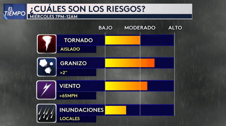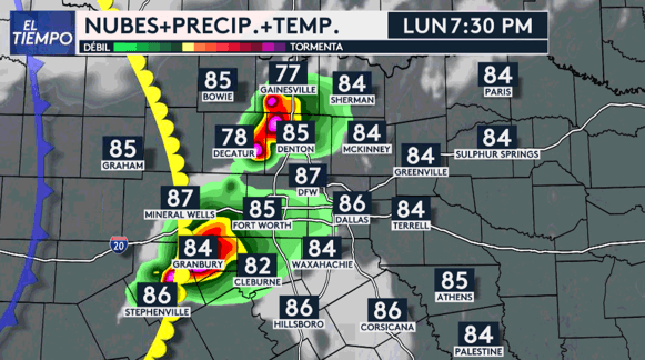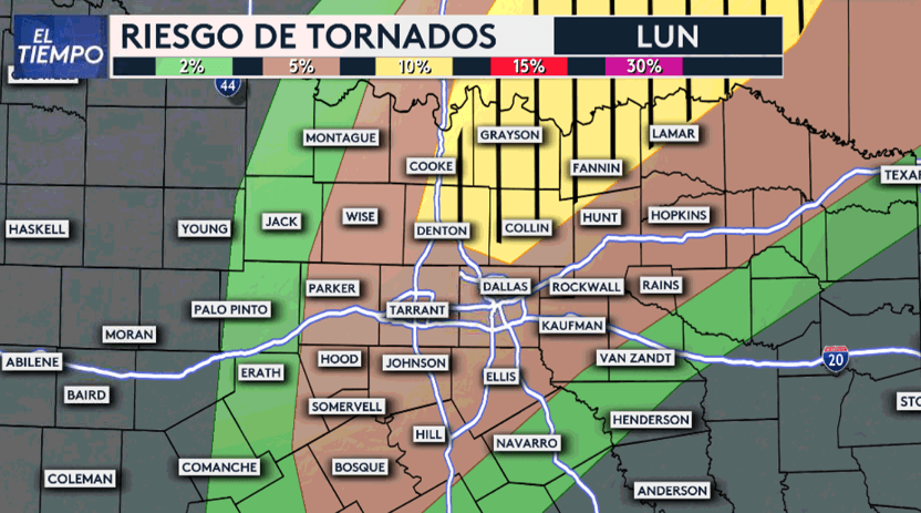 El horario estimado de impacto de las tormentas en Dallas, Tarrant, Denton y Collin es entre las 7pm y las 11pm. Atentos si vive en ciudades como Denton, McKinney, Plano y Frisco en peligro de tornado es elevado para esa zona del norte de Texas.