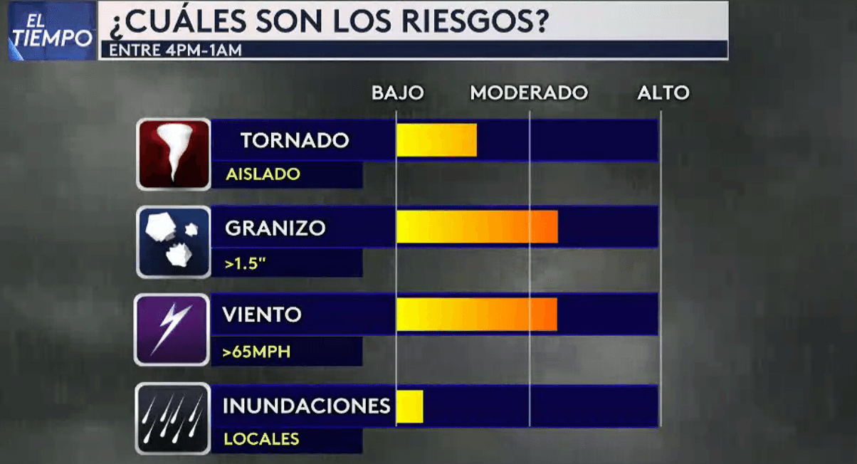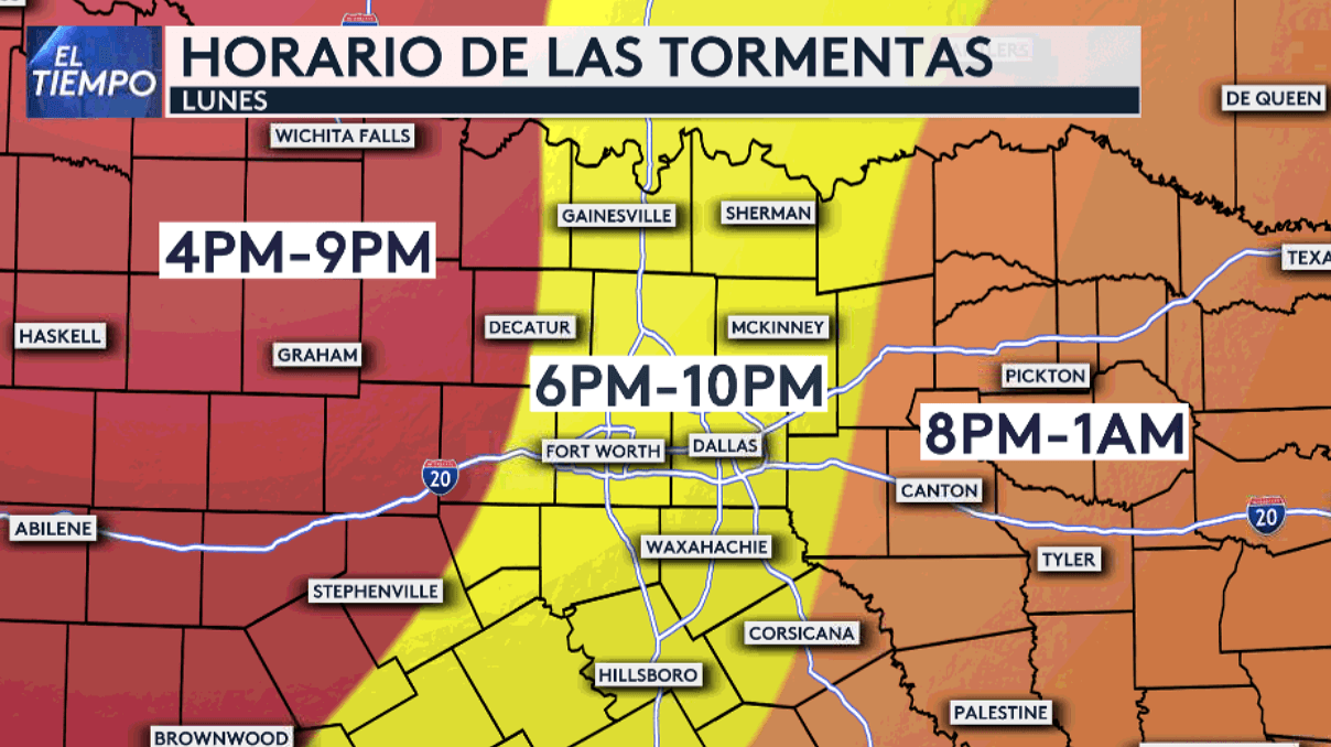 Las tormentas se estarán moviendo de oeste a este conforme transcurre la tarde-noche. El horario más activo de las tormentas en el Metroplex será aproximadamente entre las 6pm a 10pm y hacia el oeste a partir de las 4pm. Luego de la media noche las tormentas se alejan y regresa la calma antes del amanecer del martes.