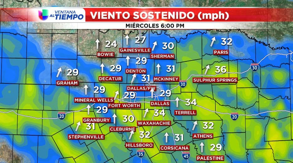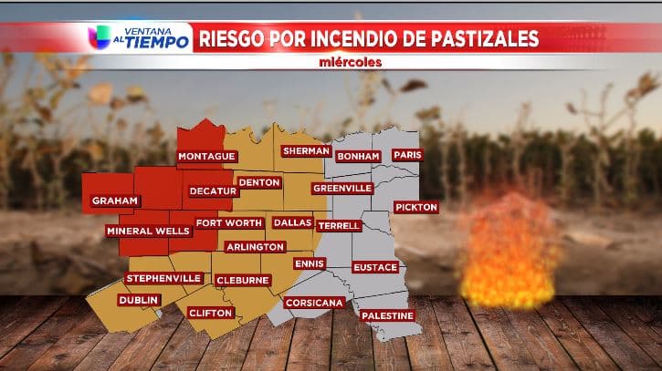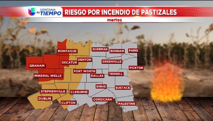 El peligro será crítico hacia el oeste-noroeste de Fort Worth. A partir del martes en la mañana, hasta el jueves en la tarde, estará vigente una vigilancia de incendio de pastizales para los siguientes condados: Montague, Young, Jack, Wise, Stephens, Palo Pinto, Parker, Eastland.