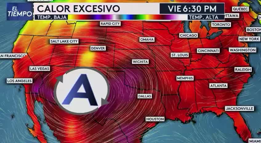 DALLAS, Texas. - Este evento de calor peligroso es el resultado de un enorme sistema de baja Alta Presión hacia el suroeste del país. El mismo se estancará al oeste de Texas y mantendrá su circulación cerca de nuestra área por varios días. Dentro del mecanismo de circulación de la atmósfera las altas presiones se caracterizan por aire descendente (aire que baja). Durante los meses verano la radiación solar es mas intensa por lo que calienta el aire rápidamente. Aire caliente que tiende a subir y luego es forzado a bajar por la Alta Presión.