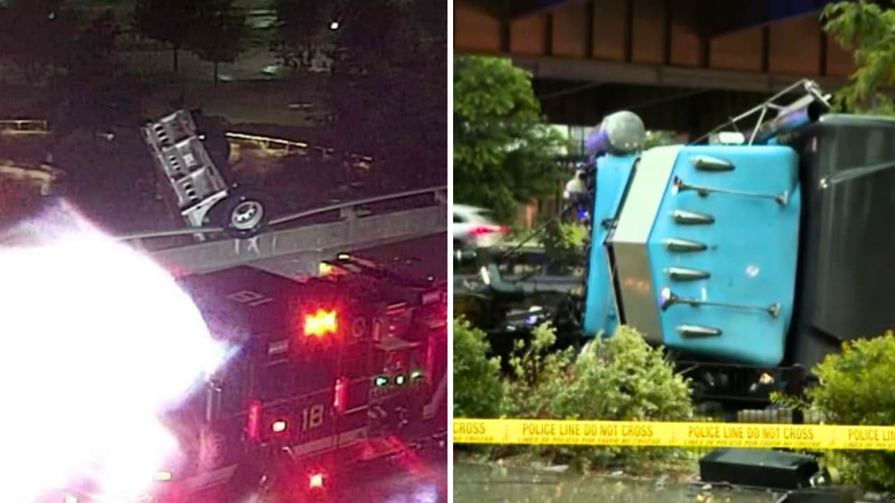 Poco antes de las 5 de la mañana, en un miércoles lluvioso con varias alertas de inundaciones y tiempo severo, un camión de 18 ruedas cargado con material de construcción quedó colgado durante varias horas sobre un puente en dirección sur en la carretera 345 (US 75), en el centro de la ciudad de Dallas. El conductor fue trasladado en estado estable a un hospital, según la oficina del Sheriff del Condado de Dallas. Otro auto estuvo involucrado en el accidente, pero no hay reporte sobre los pasajeros. Los equipos de rescate dejaron caer el camión vacío desde lo más alto para retirarlo de forma segura.