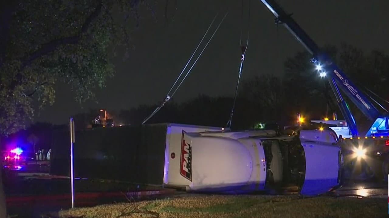 Camión derribado por los fuertes vientos en Irving