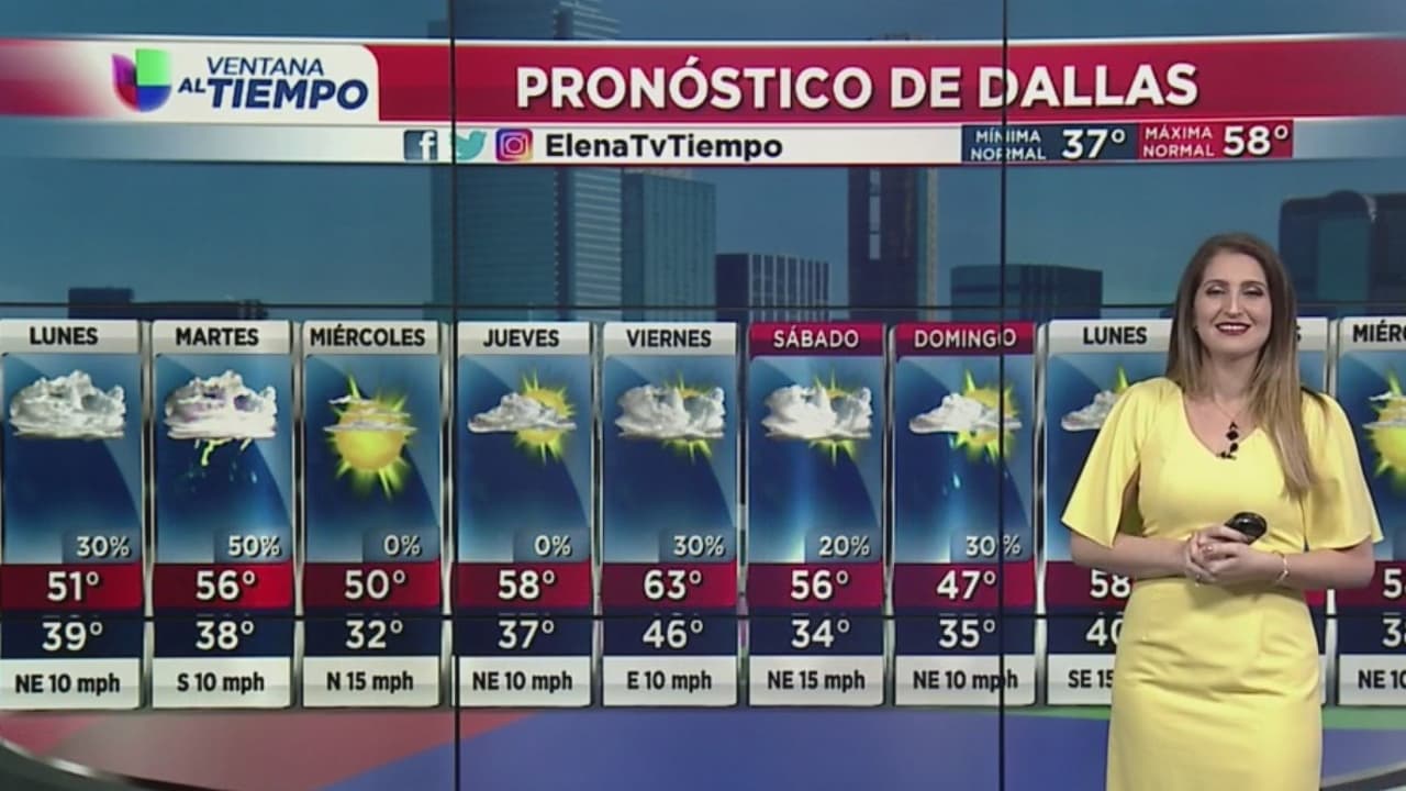 Nuestra meteoróloga Elena Tabraue presenta el pronóstico del tiempo para Dallas y sus alrededores. Este lunes, habrá un descenso en las temperaturas asociado con el paso de un frente frío sobre la región.
