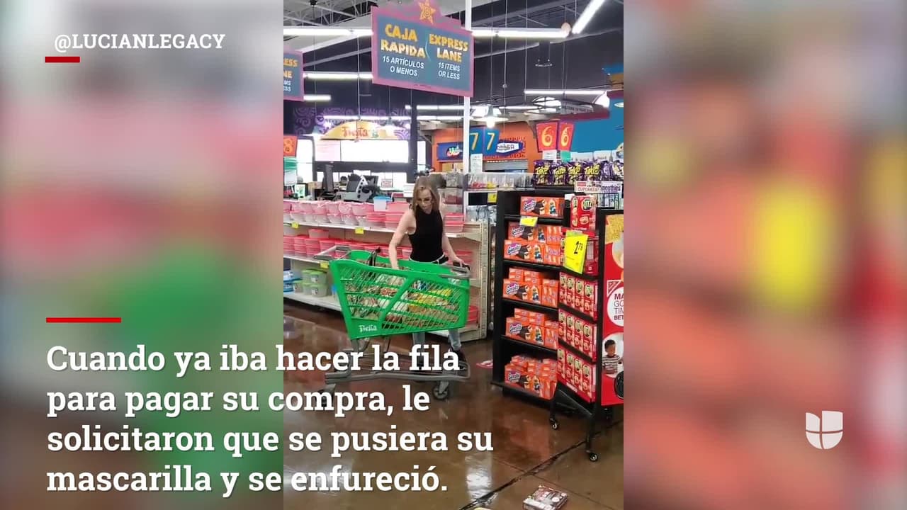 La mujer fue captada en video gritando palabras soeces y lanzando los productos en el supermercado Fiesta después de que le solicitaran que se pusiera su cubrebocas. El condado de Dallas exige a los negocios que se aseguren de que clientes y empleados usen mascarillas.