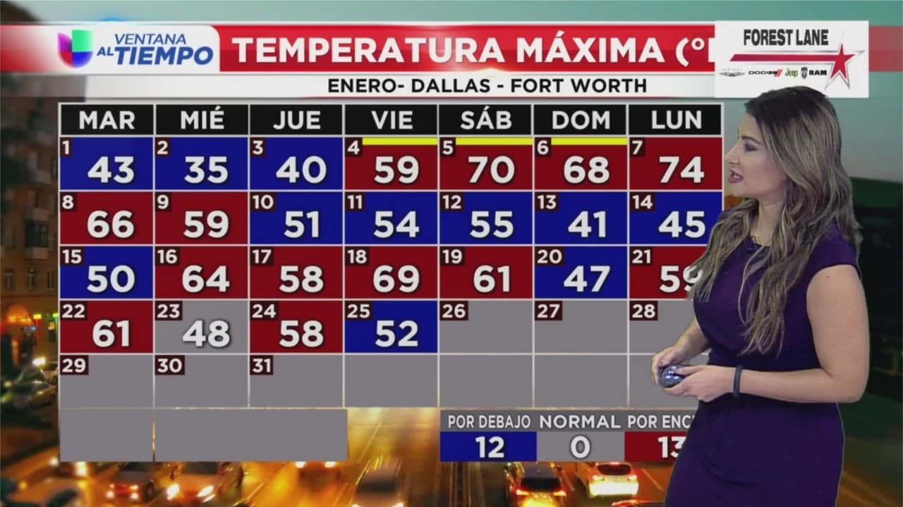 Durante este sábado, las temperaturas máximas en el Metroplex se ubicarán en los 55 grados Fahrenheit y las mínimas en 34 grados. A partir del mediodía del lunes, habrá un descenso en las temperaturas asociado a una masa de aire ártico.