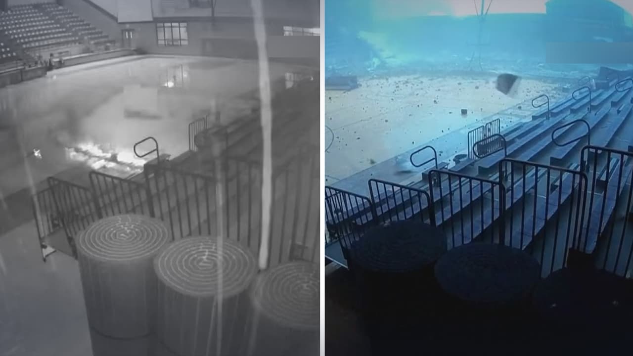 Videos de las cámaras de seguridad de la Escuela Primaria de Jacksboro, ubicadas en distintas partes de las instalaciones, captaron el dramático momento en que todo se destruye con el paso del tornado EF-3 y cómo el director alcanzó a resguardarse.