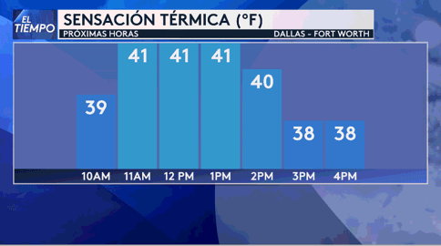 Debido a la llegada de un fuerte frente frío que estará moviéndose a través de Dallas-Fort Worth entre 11am-1pm. Las áreas de lluvias se moverán de oeste a este aumentando en cobertura a partir de las 8am. Y la temperatura de sensación bajará al rango de los 30s tan pronto el frente pase, debido a los fuertes vientos del noroeste.