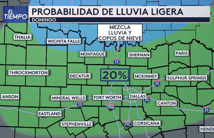 Un segundo frente frío (muy débil) llegará al norte de Texas el domingo en la mañana reforzando el frío en nuestra región. Este pequeño sistema podría causar un poco de llovizna, especialmente en ciudades cerca de la frontera con Oklahoma. Les tendremos información sobre actualizaciones de los modelos meteorológicos respecto a estos frentes en nuestros noticieros de Univisión Dallas-Nelly Carreno.