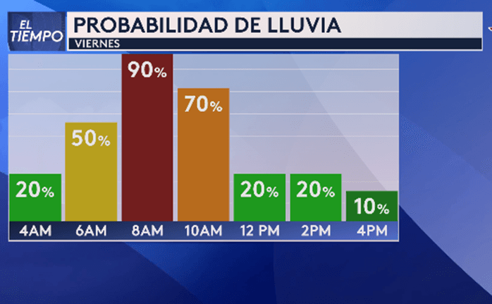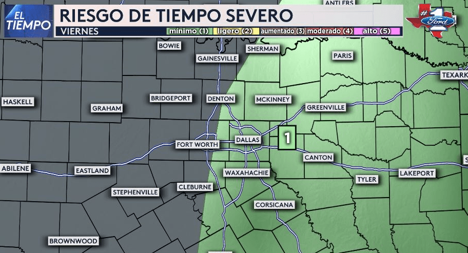 Lluvias ligeras a moderadas comenzarán en el norte de Texas durante la madrugada y continuarán hasta alrededor de las 2 pm. Las lluvias impactarán el tráfico matutino, por eso les recomiendo planificar una salida de casa más temprana. Tendremos algunas tormentas eléctricas, especialmente hacia el este de la I35, pero el riesgo de tiempo severo es mínimo con este sistema. El único peligro que veo por ahora son los rayos que acompañarán las tormentas.
