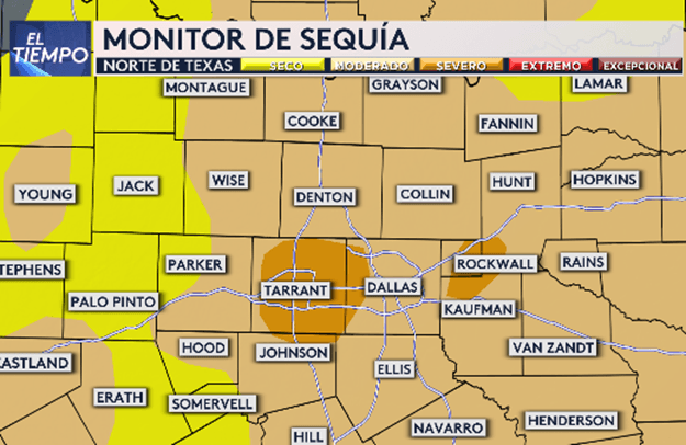 Nosotros en el norte de Texas también necesitamos precipitación. Esta mañana nos llegó la última información del monitor de sequía y la mayor parte del condado Tarrant tiene una sequía severa.