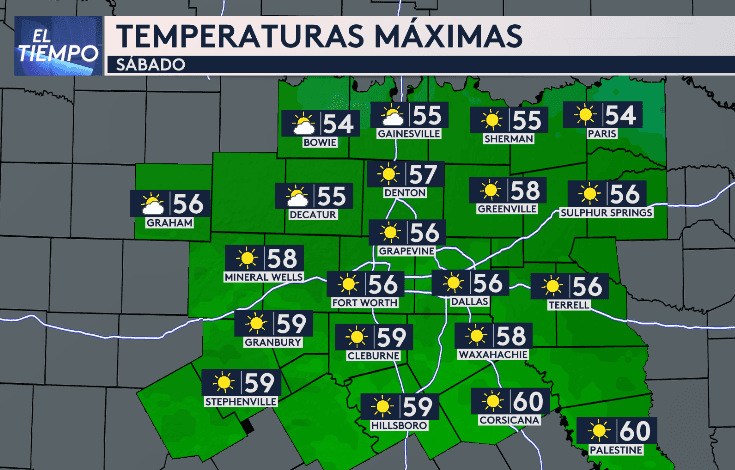 Después de que pase el frente el viernes en la tarde (4pm-7pm), los vientos cambiaran de dirección y soplaran del norte con ráfagas de 15 a 20 mph. Estos vientos traerán aire mucho más frío y seco del norte a Dallas- Fort Worth y sus alrededores el sábado. Las temperaturas máximas el sábado estarán en los 50s.