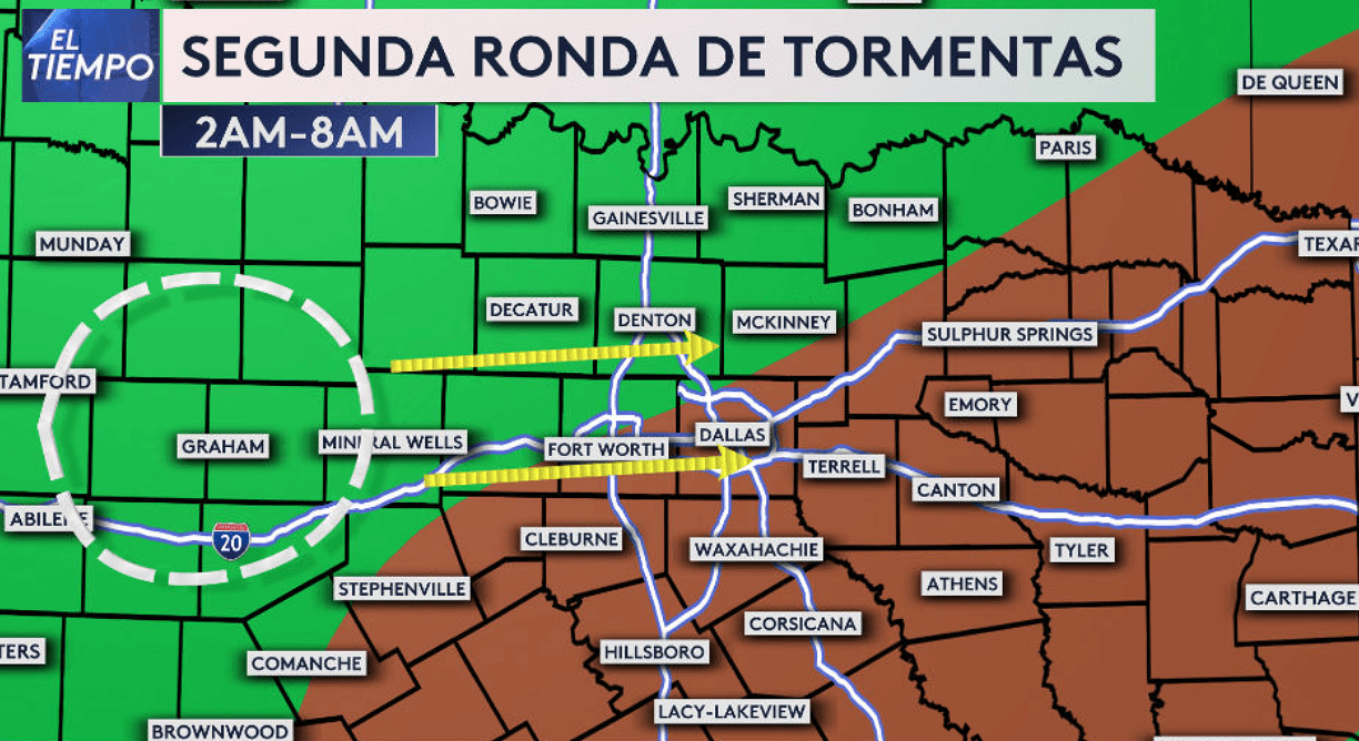 La primera ronda de tormentas se estará desarrollando sobre los condados Erath, Comanche y Bosque. Este grupo de tormentas se estará desplazando a través del Metroplex a partir de las 5pm hasta las 11pm. Con esta ronda la amenaza principal es por vientos dañinos, granizos y algún tornado aislado.