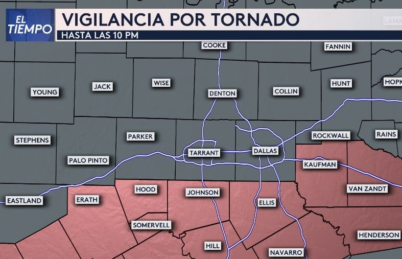 DALLAS, Texas. - Algunos condados del norte de Texas están bajo Vigilancia por Tornado este martes por la tarde ya que se acercan dos rondas de aguaceros torrenciales y tormentas severas llegan al norte de Texas durante esta tarde y noche. Los condados de Dallas, Tarrant, Denton y Collin están bajo Vigilancia por Tormentas Severas hasta las 10 pm. El peligro esta tarde y noche será granizo de 1” + de diámetro y la posibilidad de un tornado.