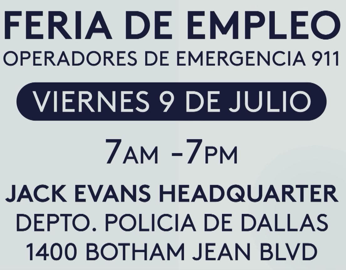 El departamento de la policía de Dallas tendrá una feria de trabajo de 7:00 a.m. – 7:00p.m. este viernes, 9 de julio. Están buscando contratar a operadores para el servicio de emergencias 9-1-1. Ofrecen un incentivo de $3,00 para quienes hagan el entrenamiento.