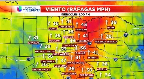 Una perturbación que se encuentra sobre las montañas rocosas se mueve hacia el este y formará un sistema de baja presión sobre Kansas. El cambio de presión se sentirá en el norte de Texas con fuertes vientos del sur con ráfagas de 30 -35 mph durante el día. La combinación de las altas temperaturas y los fuertes vientos aumentarán el riesgo de incendios de pastizales hacia el este de la I35.