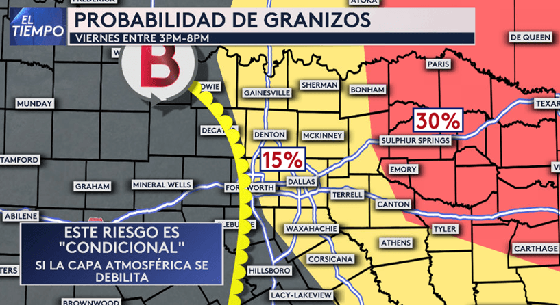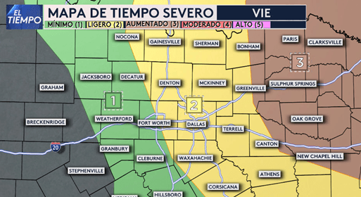 La última actualización del Centro de Predicción de Tormentas ha desplazado el riesgo “aumentado de tiempo severo” hacia el extremo este del norte de Texas. Se encuentra bajo riesgo “ligero” de tiempo severo, mayormente ciudades al este de la autopista I-35 / I-35W.