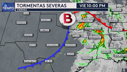 Con la segunda ronda de tormentas el desarrollo de superceldas estará concentrado mayormente al este de las autopistas 75 y 45. La amenaza principal con esta ronda de tormentas es por granizo grande y fuertes ráfagas de vientos.