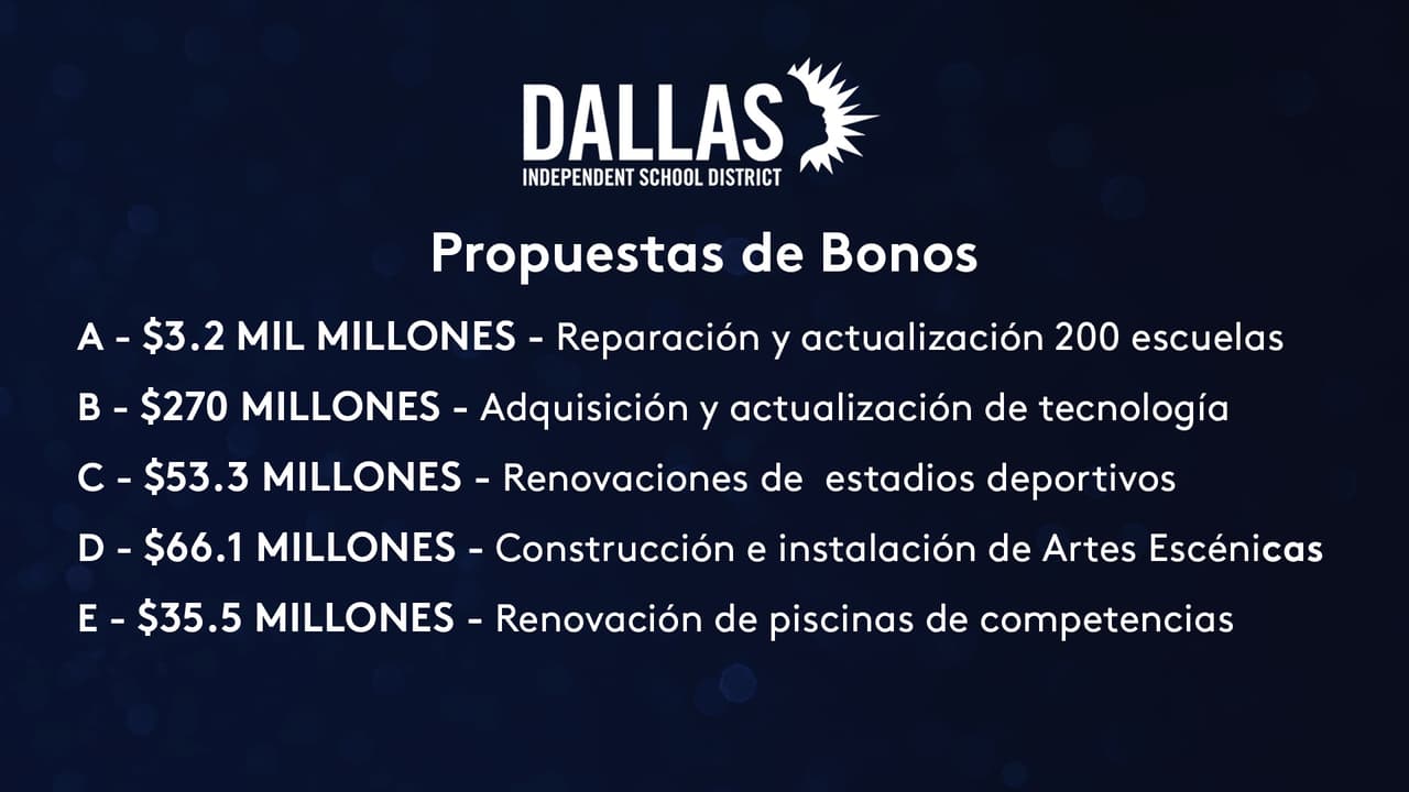 La propuesta del Distrito, que encontrarán los votantes de Dallas al final de su boleta electoral, incluye cinco bonos.