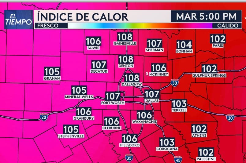DALLAS, Texas .- Se ha emitido una ADVERTENCIA POR CALOR el martes y miércoles para la mayor parte del norte de Texas. Ambos días el índice de calor alcanzará 105 F – 109 F durante la tarde. Tome las precauciones necesarias para que no sufran un golpe de calor.