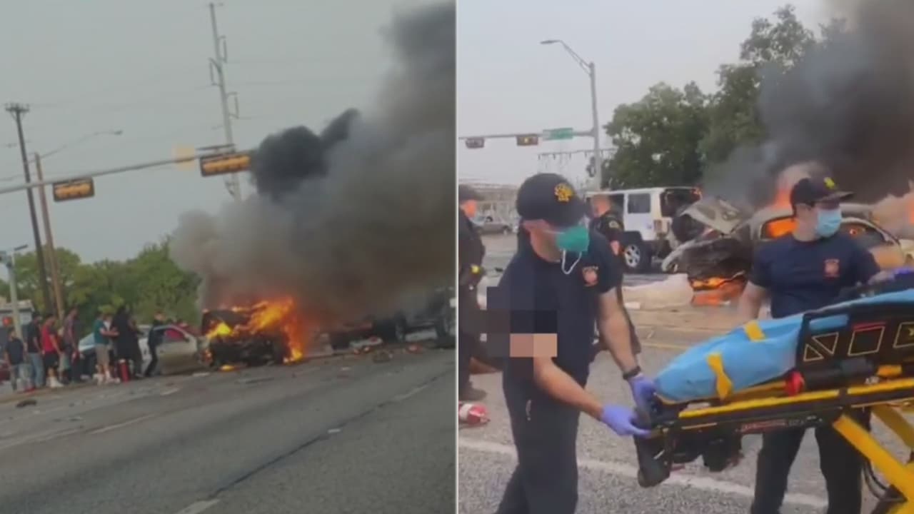 En las imágenes se puede observar cómo varias personas intentan sacar a un hombre que quedó atrapado en su vehículo cuando este se prendió en llamas. El accidente ocurrió la tarde del sábado en la intersección de North Jim Miller Road y Scyene Road.