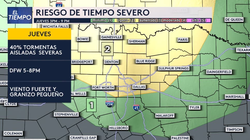 La tarde de este jueves tenemos un 40% de posibilidades de tormentas severas aisladas en diferentes partes del norte de Texas, entre las 5 de la tarde y 8 de la noche. Dallas, Fort Worth y el norte del Metroplex se mantienen en una escala de DOS, hasta CINCO, en riesgo de tiempo severo. Hay probabilidades de fuertes ráfagas de viento y granizo pequeño.