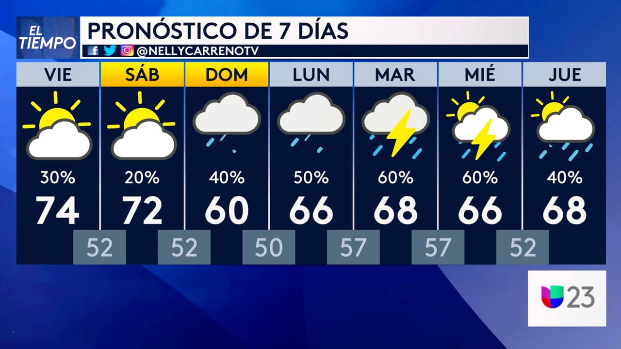 Después del paso de un frente frío, nos espera un viernes con cielo despejado y temperaturas agradables, con máximas alrededor de los 74 grados, así lo indica nuestra meteoróloga Nelly Carreño. ¿Cómo estará el fin de semana? Encuentra aquí el pronóstico completo de Nelly. Infórmate y comparte.