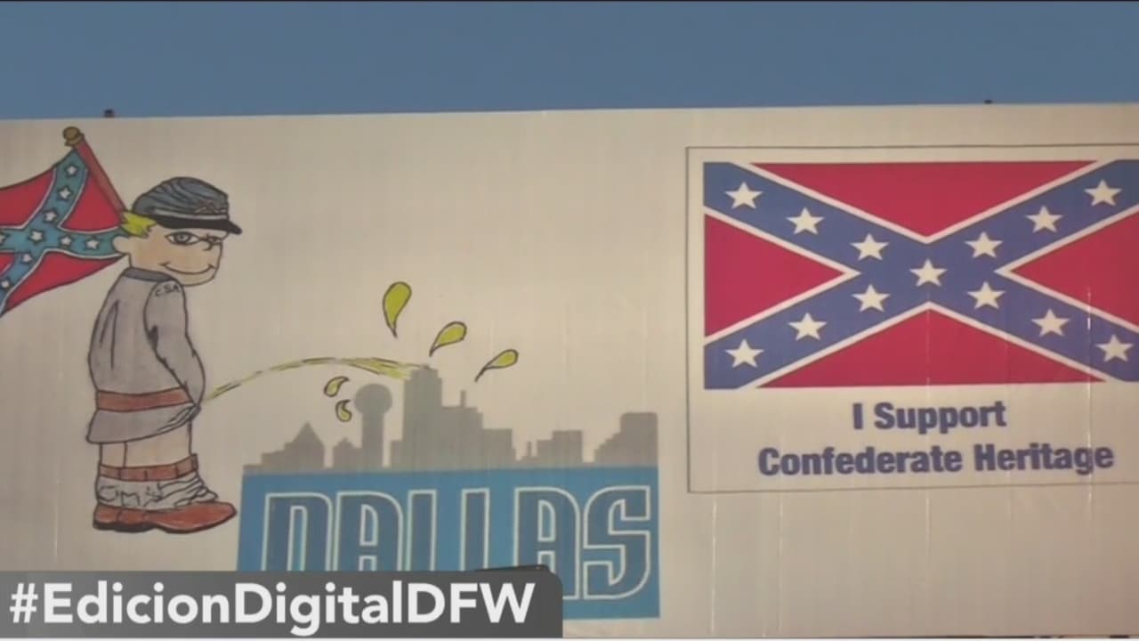 El espectacular muestra el dibujo de un soldado confederado orinando sobre el centro de la ciudad de Dallas y el mensaje “Yo apoyo la herencia confederada”. El anuncio aparece días después de que Dallas removiera estatuas que conmemoraban a soldados confederados.